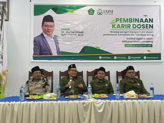 Lumajang — Institut Agama Islam (IAI) Miftahul Ulum Lumajang menggelar kegiatan Pembinaan Karir Dosen: Strategi Pengembangan Karir Dosen Profesional, Kompeten, dan Berdaya Saing pada Ahad, 16 November 2025, bertempat di Meeting Room kampus setempat. Acara ini menghadirkan narasumber nasional, Dr. Muhammad Aziz Hakim, M.H, Kasubdit Ketenagakerjaan DIKTIS Kementerian Agama RI.