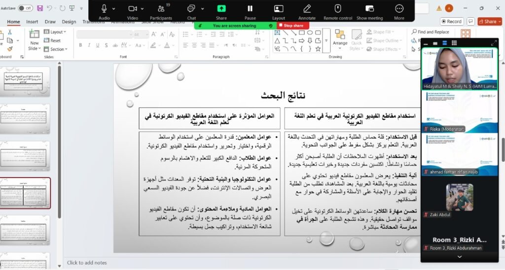 Delegasi PBA IAI Miftahul Ulum Lumajang, Hidayatul Munawaroh dan Shely Nailatus Salamah, mempresentasikan penelitian berjudul “Istikhdam Maqoti’ul Vidiyu Al Kartuniyah Al ‘Arabiyah Litanmiyati Hamaasin Wa Maharah Al Kalam Lada Al Thalabah Fii Al Madrasah Al Tsanawiyah Lumajang” (Pemanfaatan Video Kartun Berbahasa Arab untuk Meningkatkan Antusiasme dan Maharah Kalam Siswa MA Lumajang).