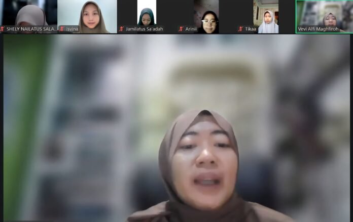 Mahasiswi Program Studi (Prodi) PGMI semester VI, Fi’syatil Kamila memandu jalannya seminar dengan komunikatif dan interaktif sehingga suasana webinar tetap hidup meskipun dilaksanakan secara daring.